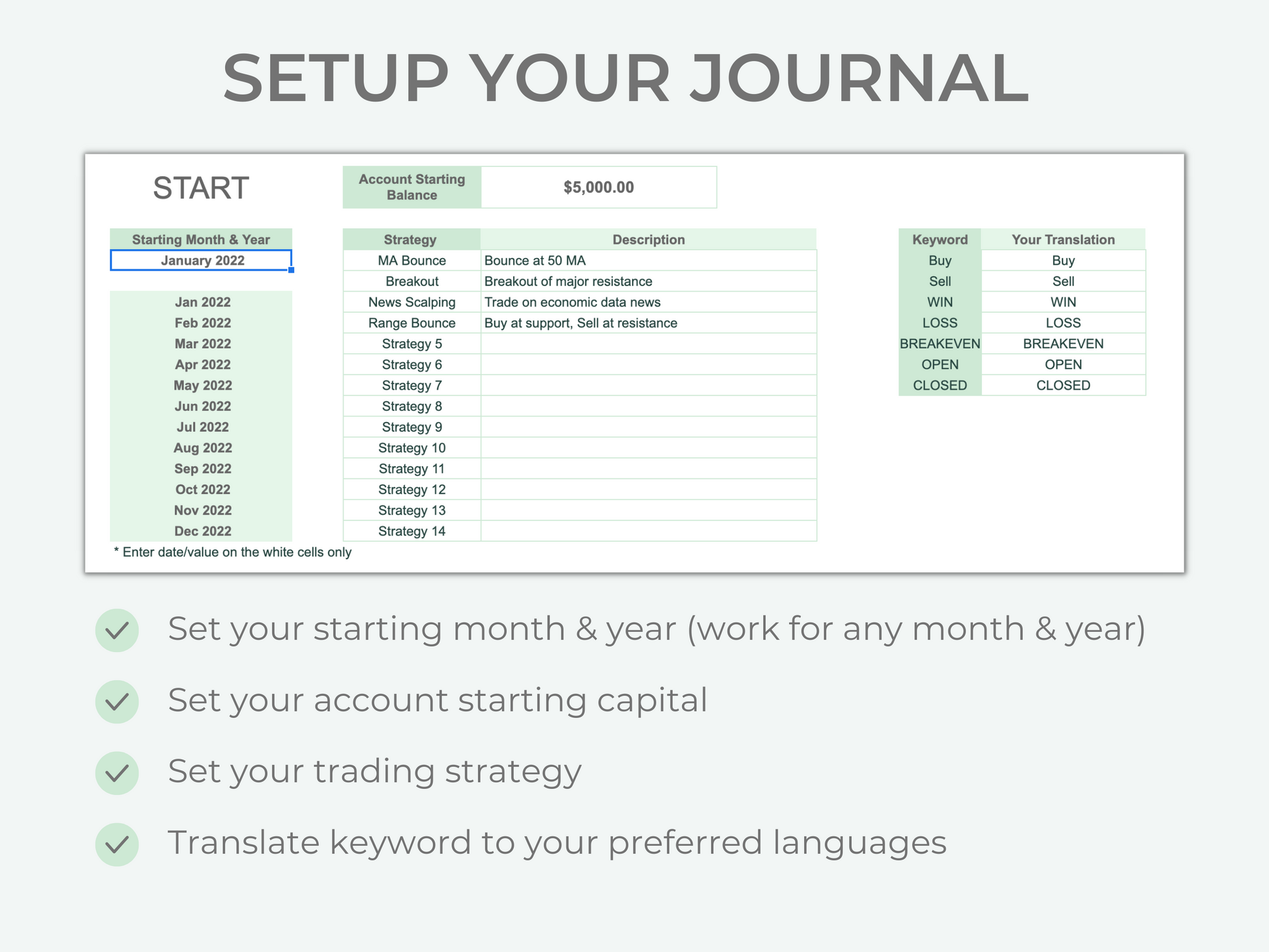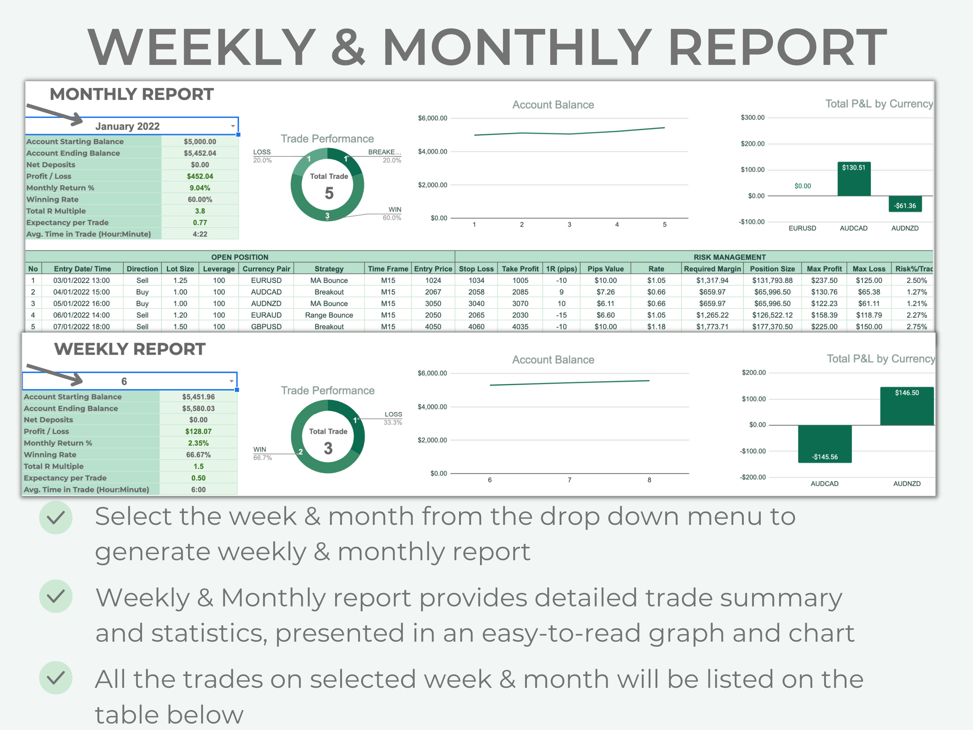 This spreadsheet consists of 8 parts, setup page, pip value table (currency pair, crypto, metals, indices, commodity), forex calculator, trading journal, weekly report, monthly report, strategy performance dashboard, trading dashboard and monthly strategy statistics