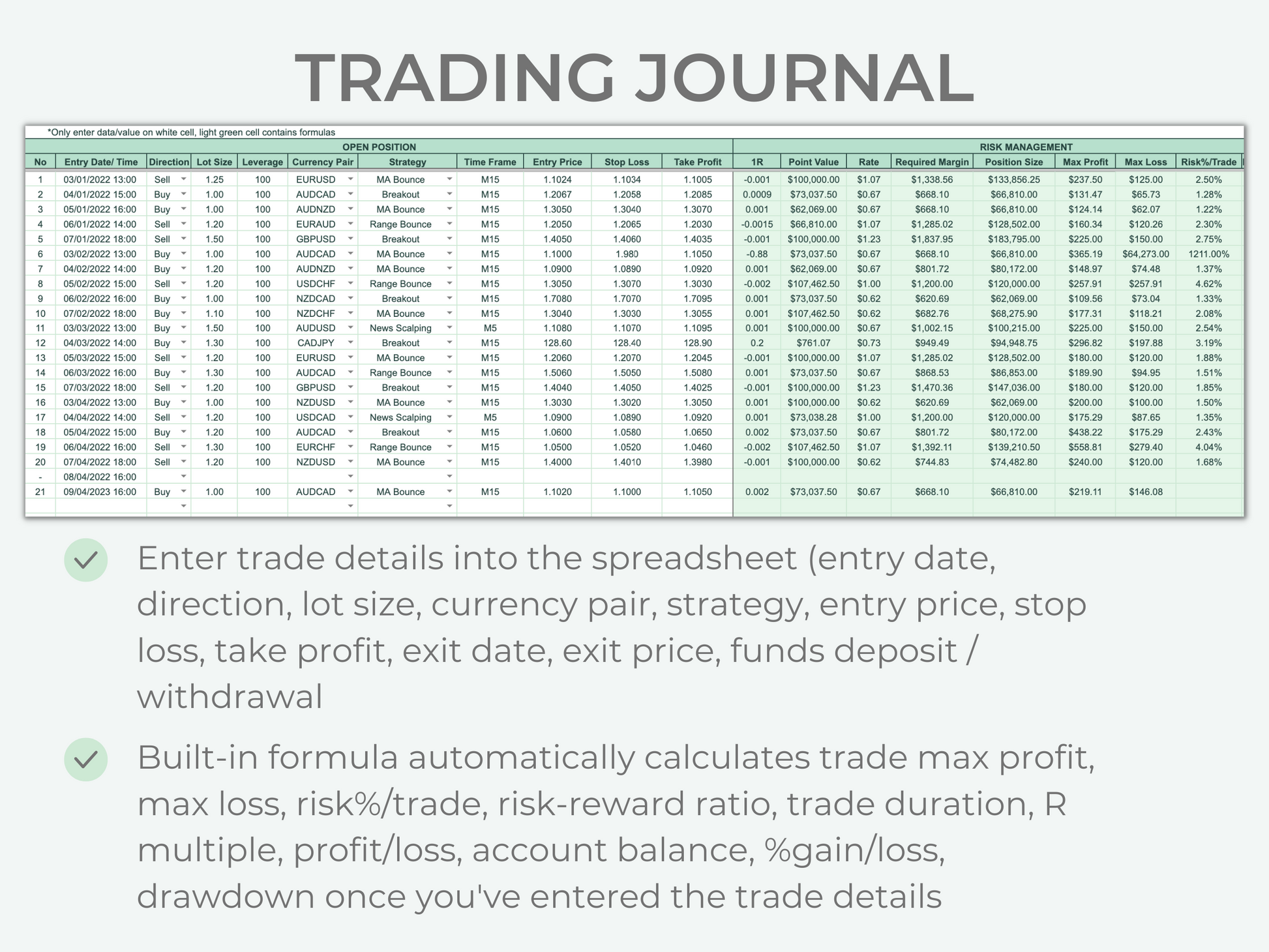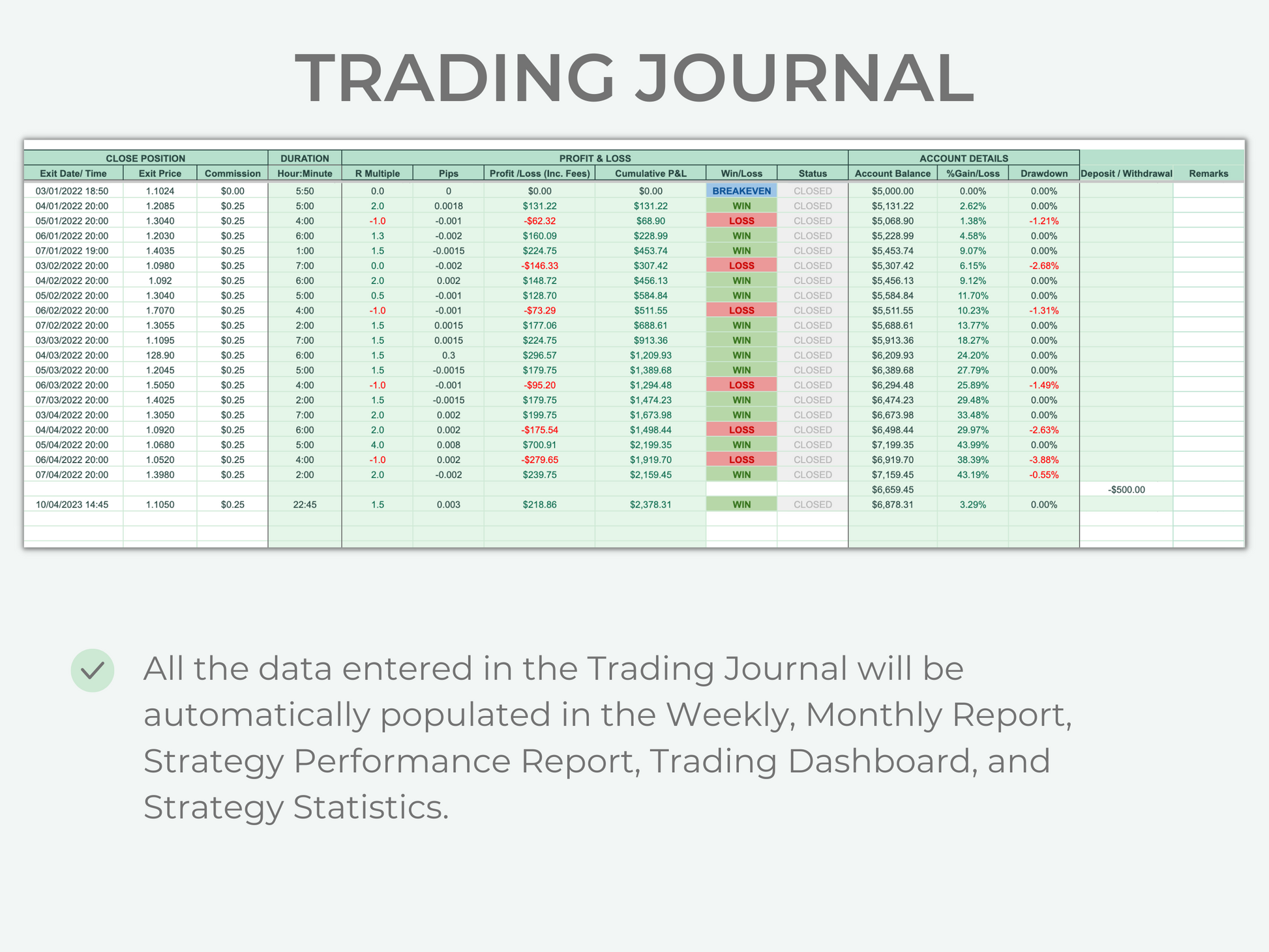 This trade journal enable you to record, keep trade and analyse your Forex trading journey effortlessly.