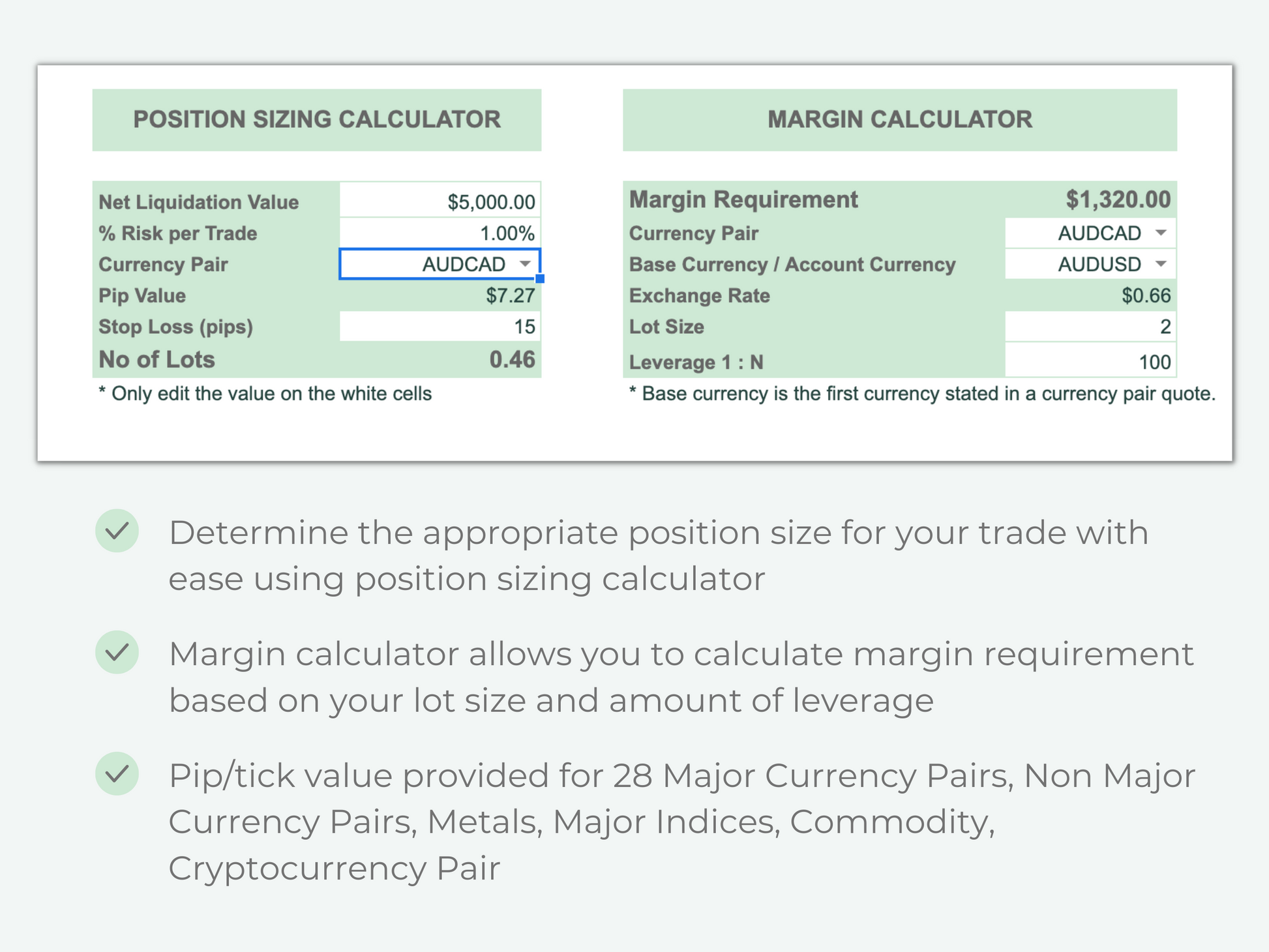 • Position sizing calculator to calculate your position size based on your net liquidation and risk %.