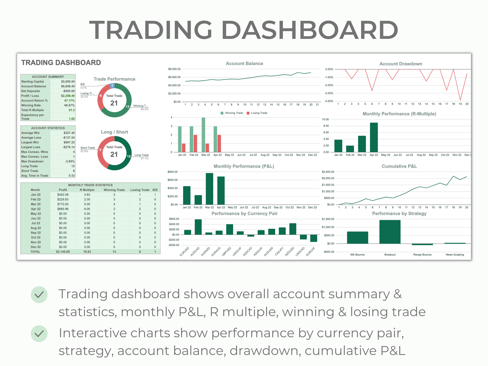 • Strategy Statistics to show your profit/loss, R-multiple gain/loss for each strategy every single month