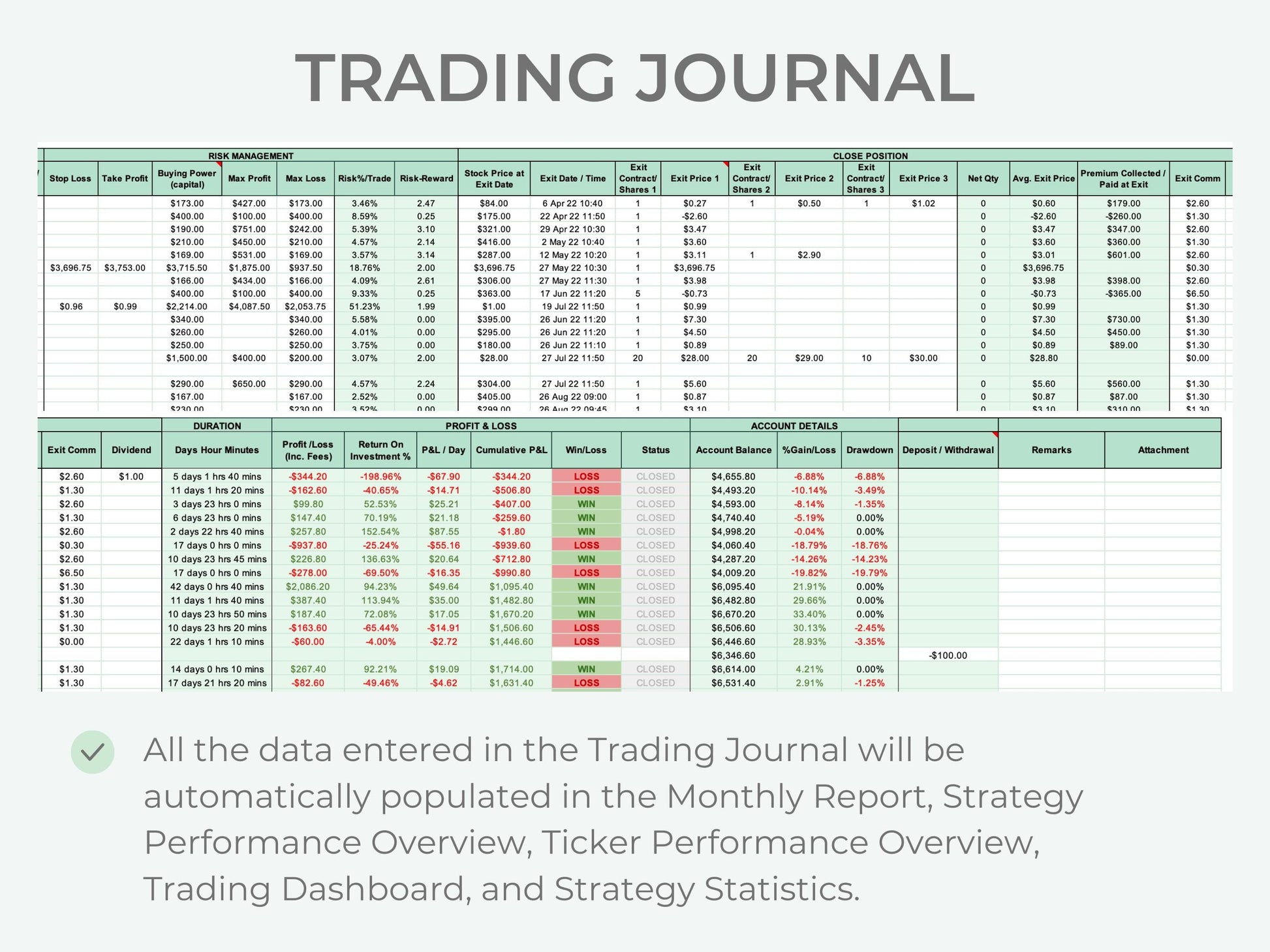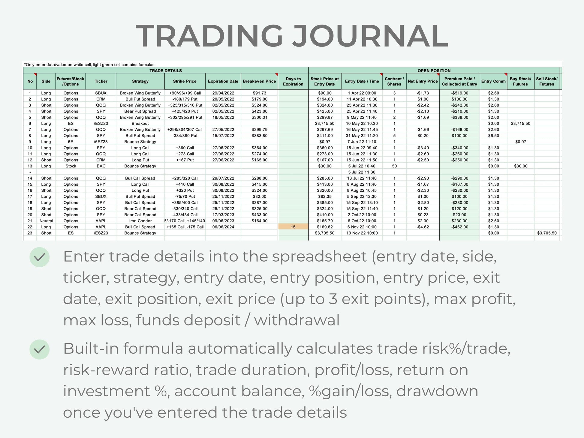 • 🧾 Comprehensive Trade Logs – Dedicated tables to record your Options, Stock, and Futures trades with ease