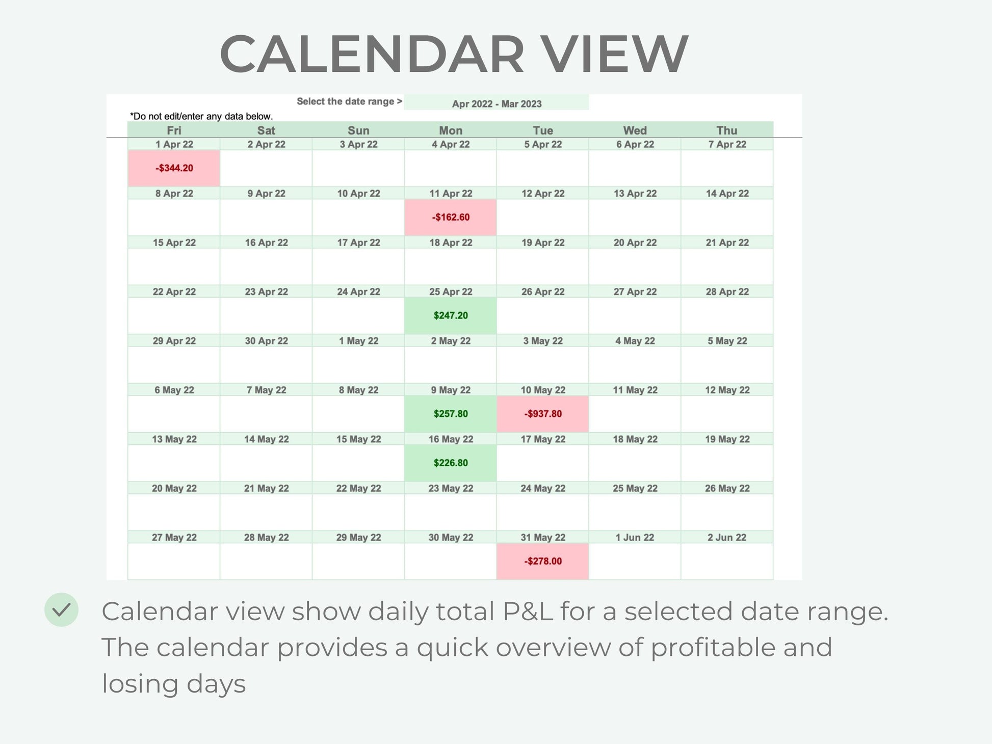 • 🗓️ Calendar View – See your daily P&L in a clear, easy-to-read calendar format