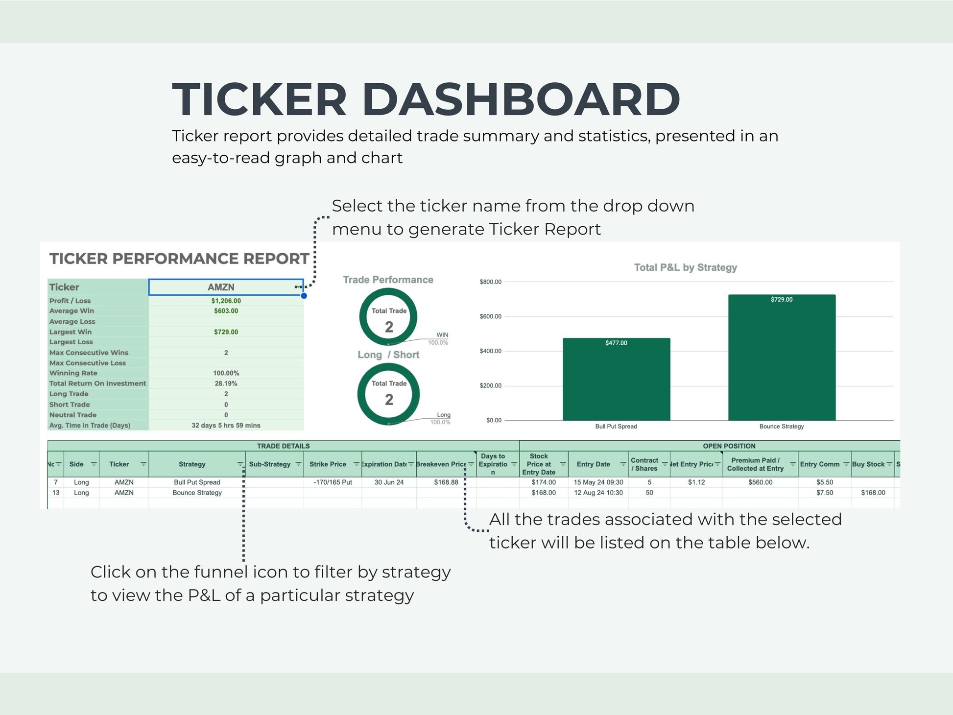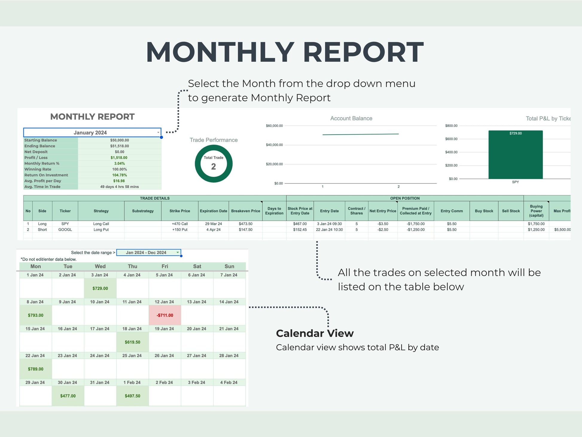 β Visual analytics: Monthly Reports, Strategy Dashboard, Ticker Dashboard, and Calendar View