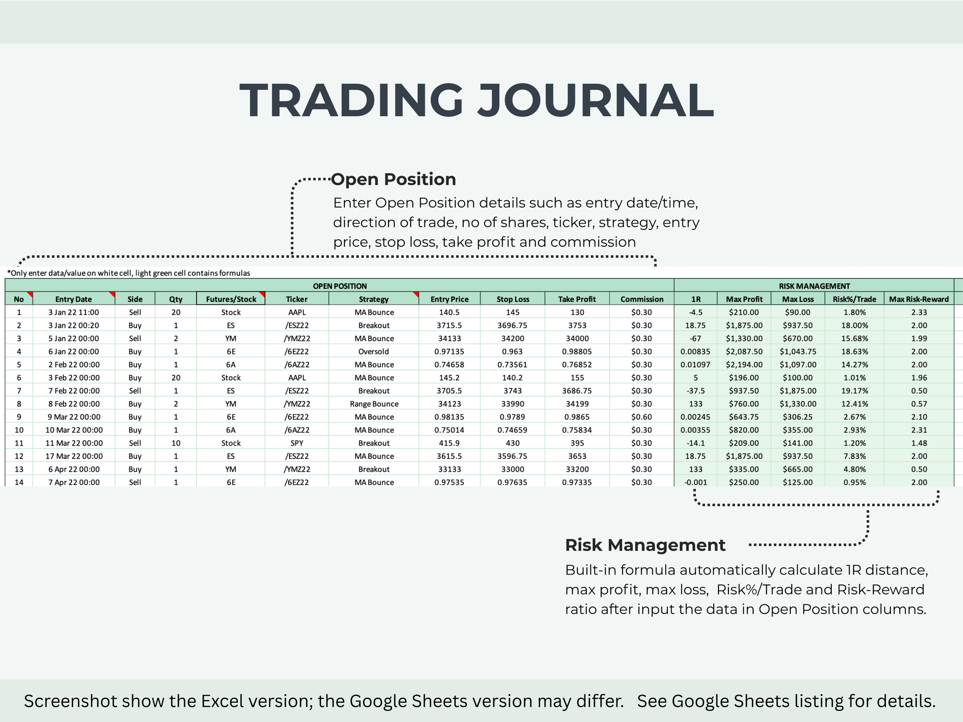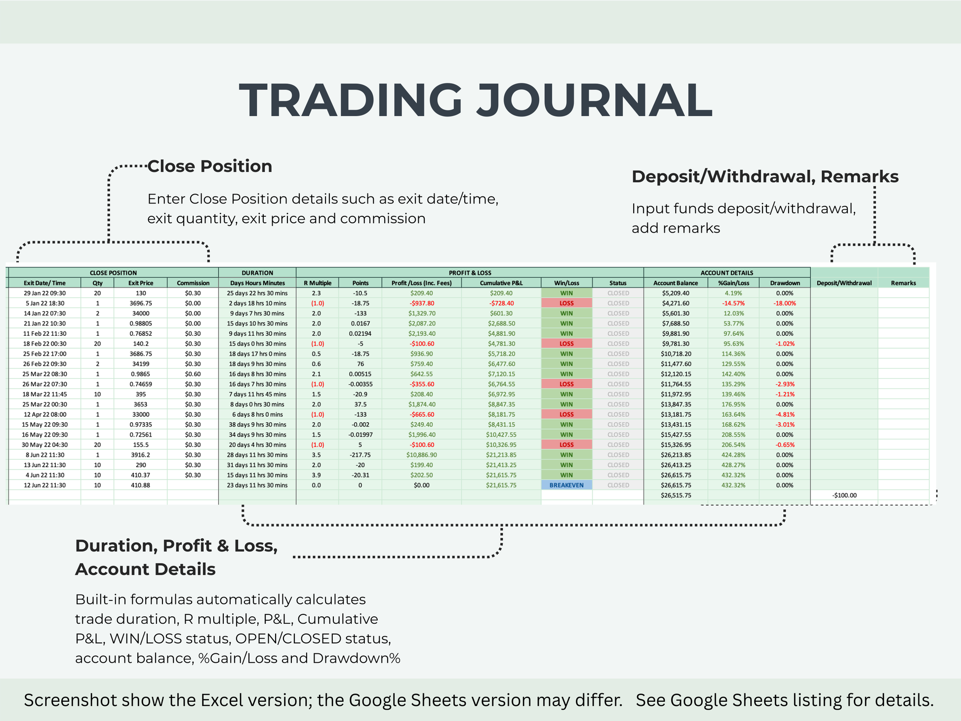 β’ π Smart Auto-Calculations β Includes R-multiple, P&L, time in trade, and more